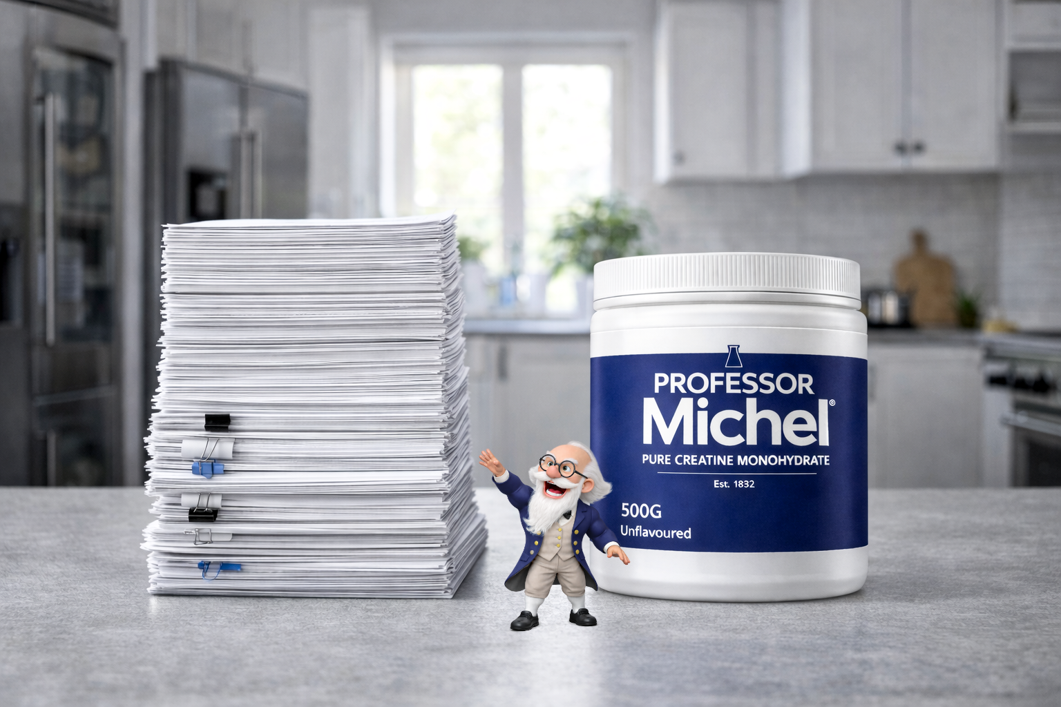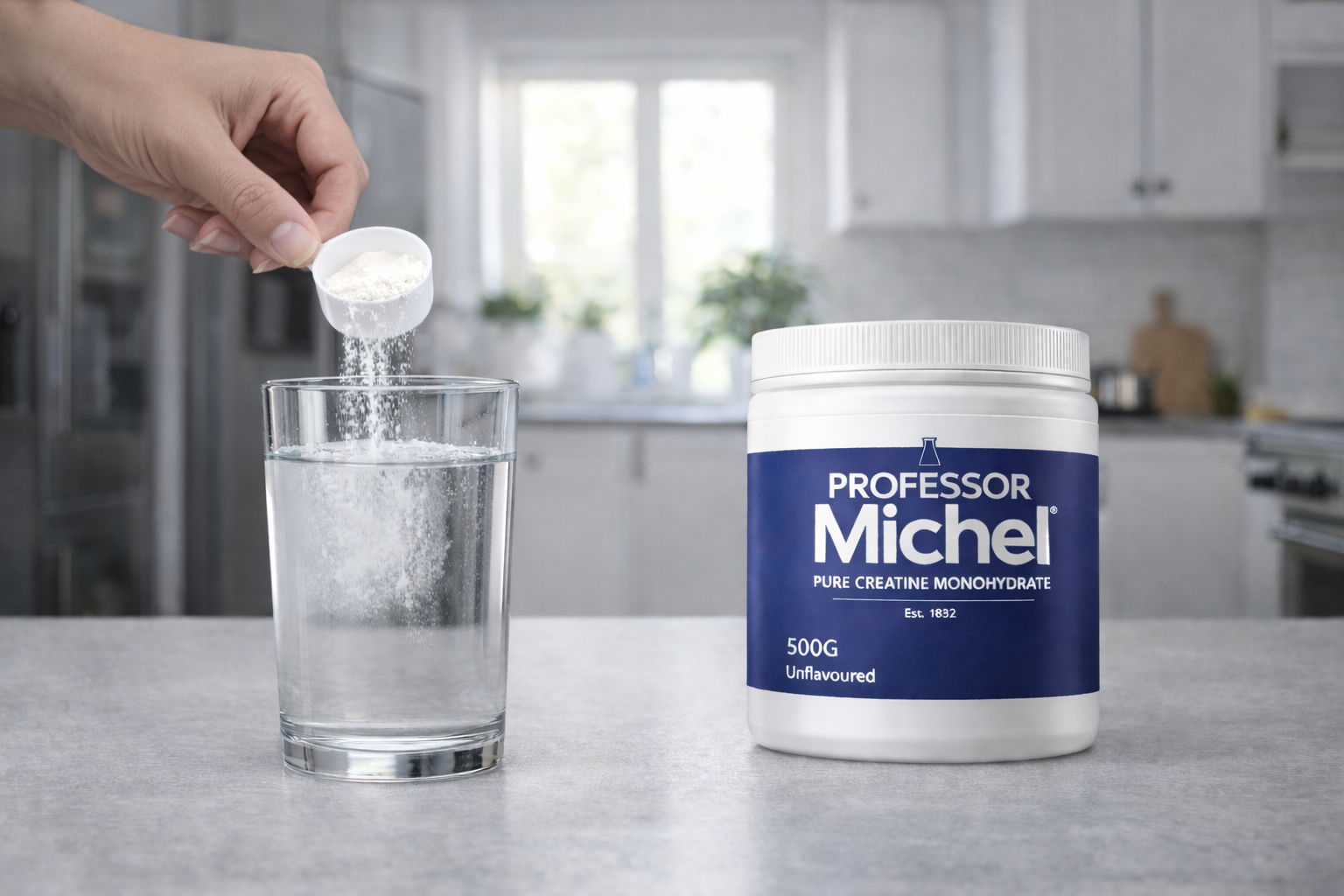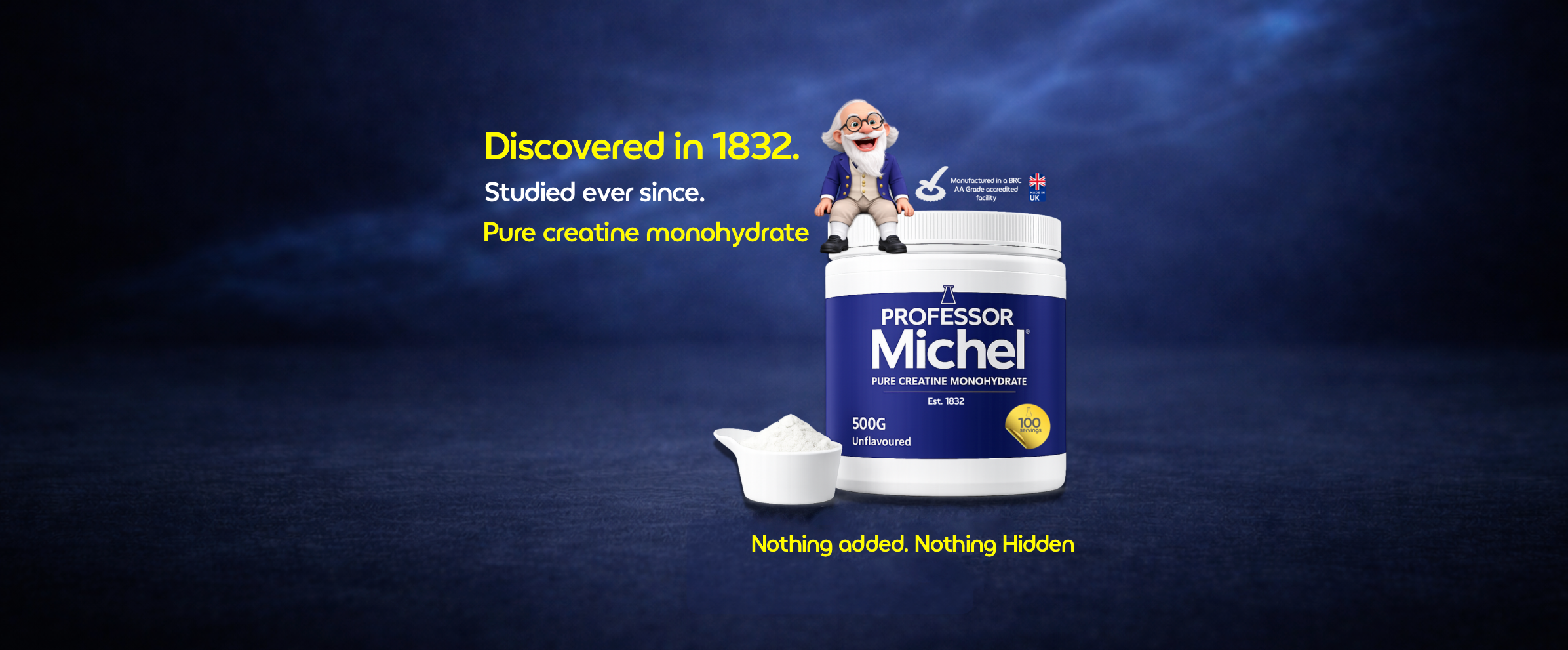 Professor Michel is pure creatine monohydrate. 200-mesh micronised — dissolves clear in water, coffee, or juice. No flavouring. No sweetener. No filler. Made in a BRC AA-grade UK facility.